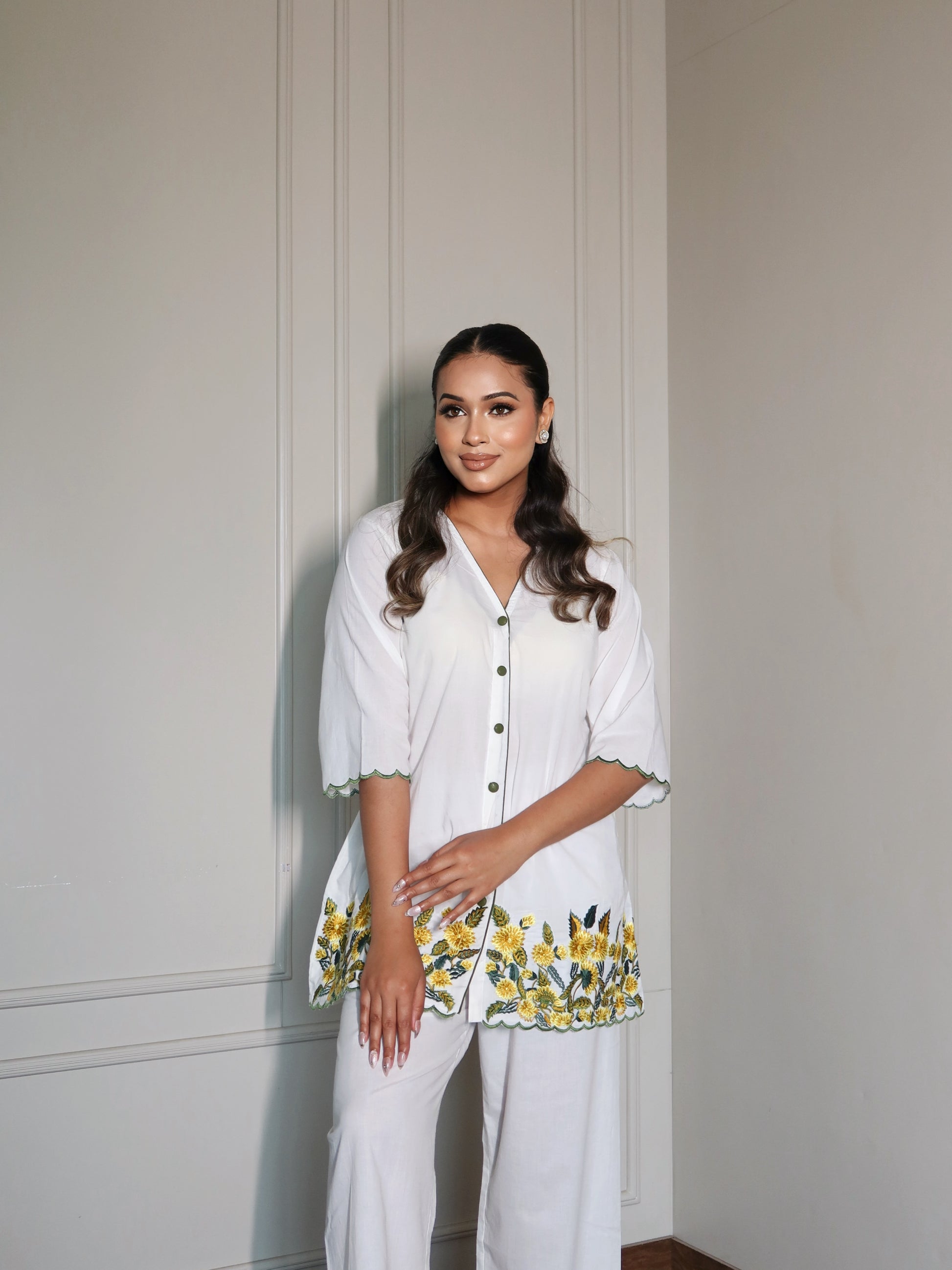 Pure mul cotton co-ord designed for effortless summer elegance. Featuring delicate shadow work along the scalloping edges.