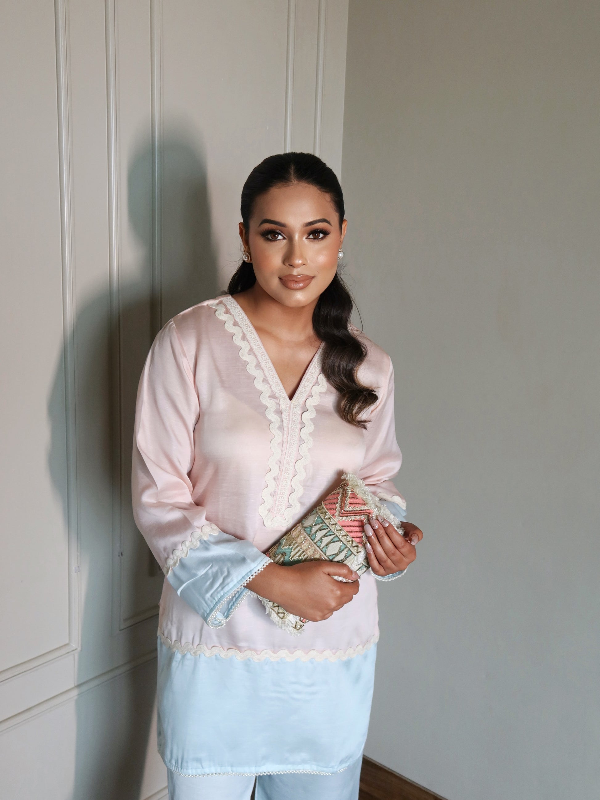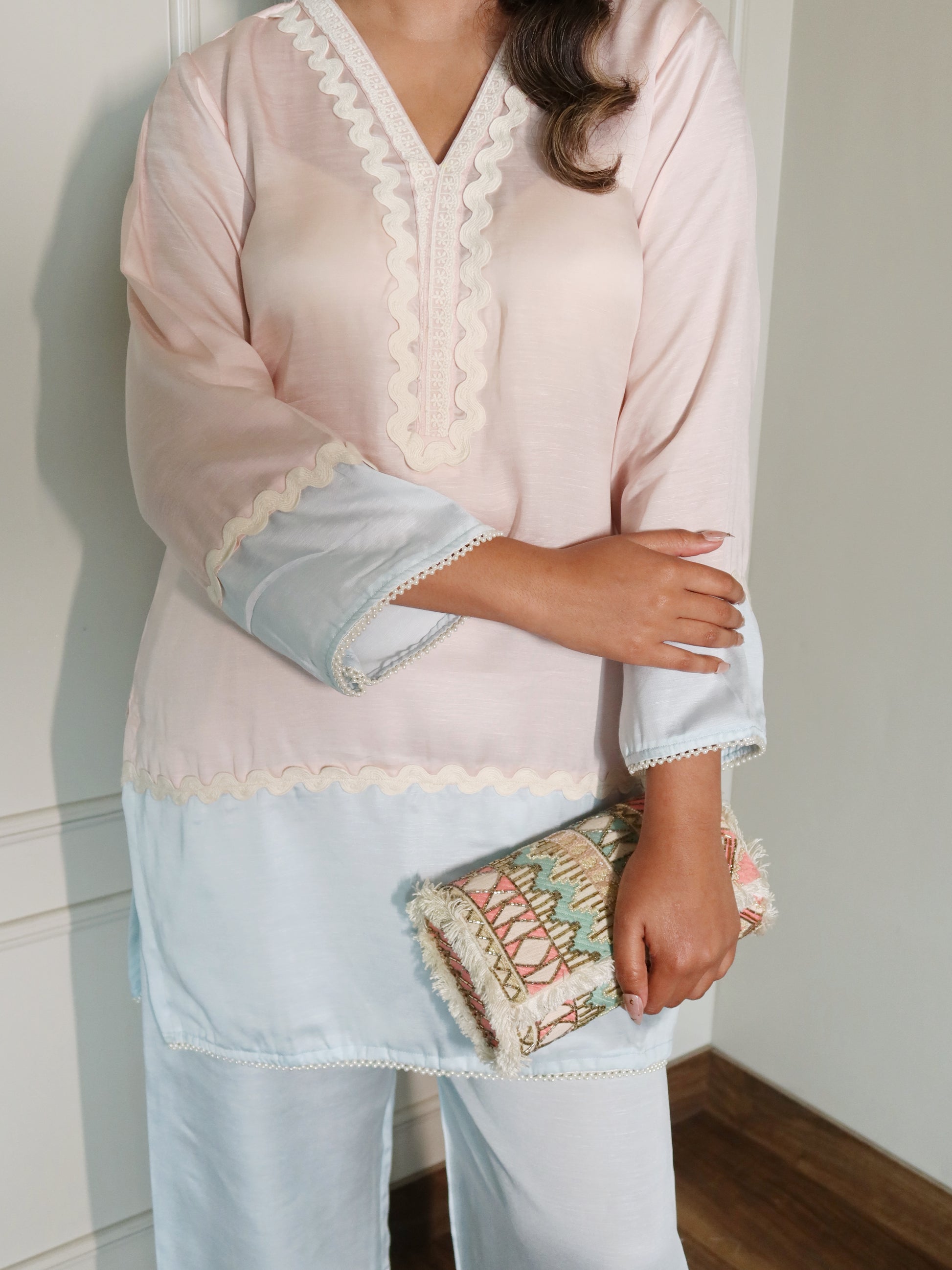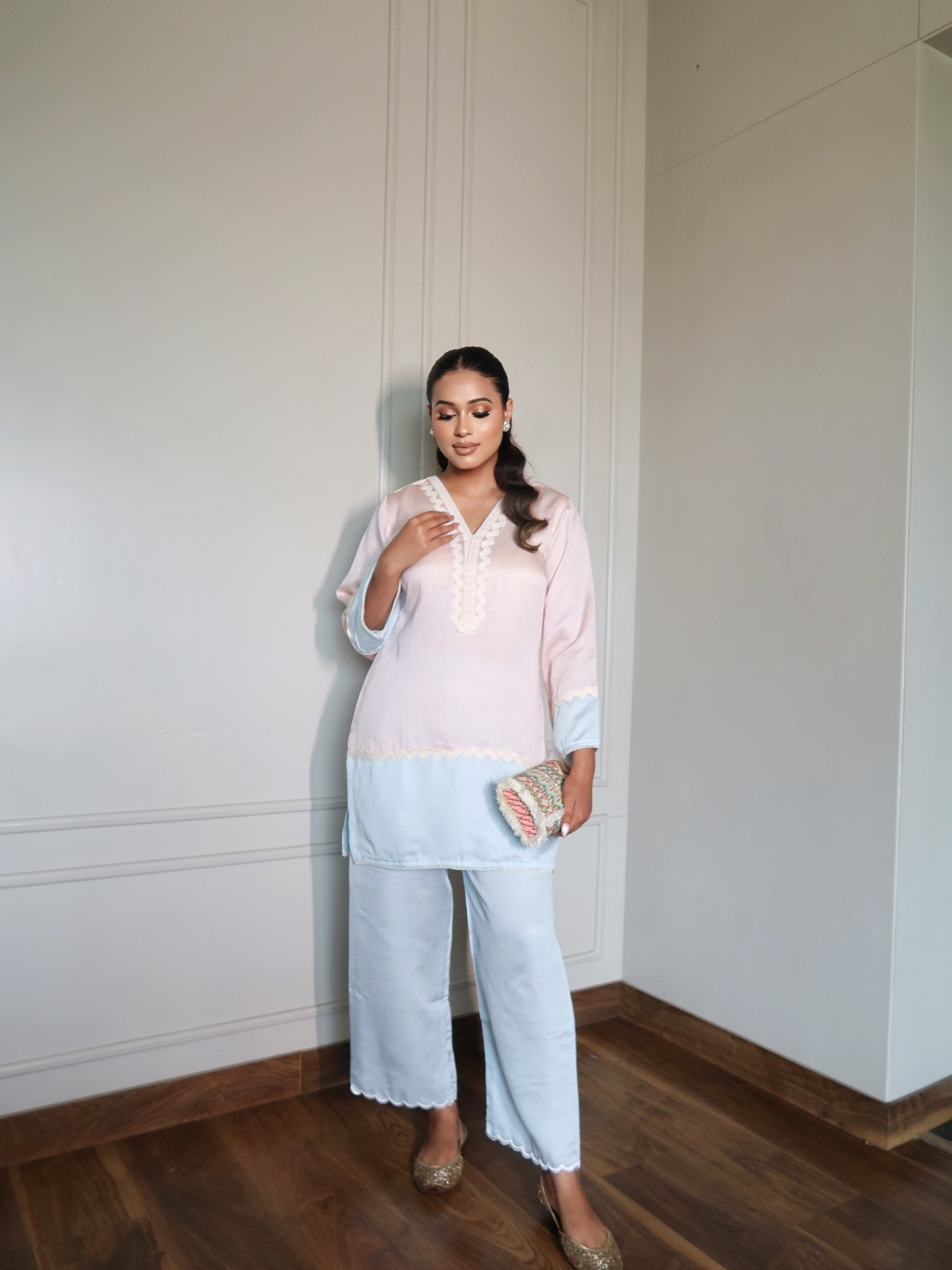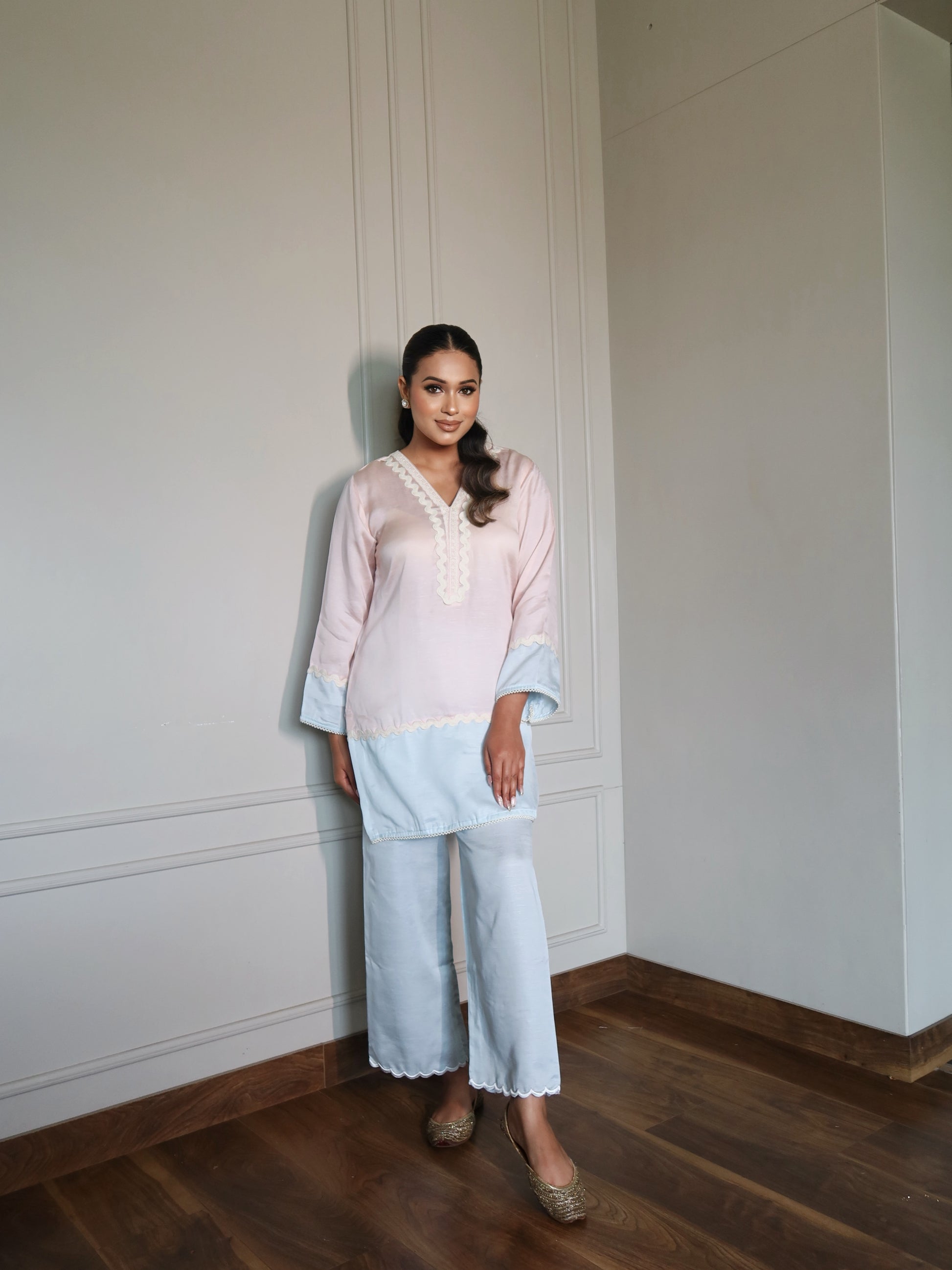 Reha is a soft blush & powder blue co-ord set crafted in breathable fabric for effortless comfort. Finished with delicate scalloped edges. (The Summer Edit)