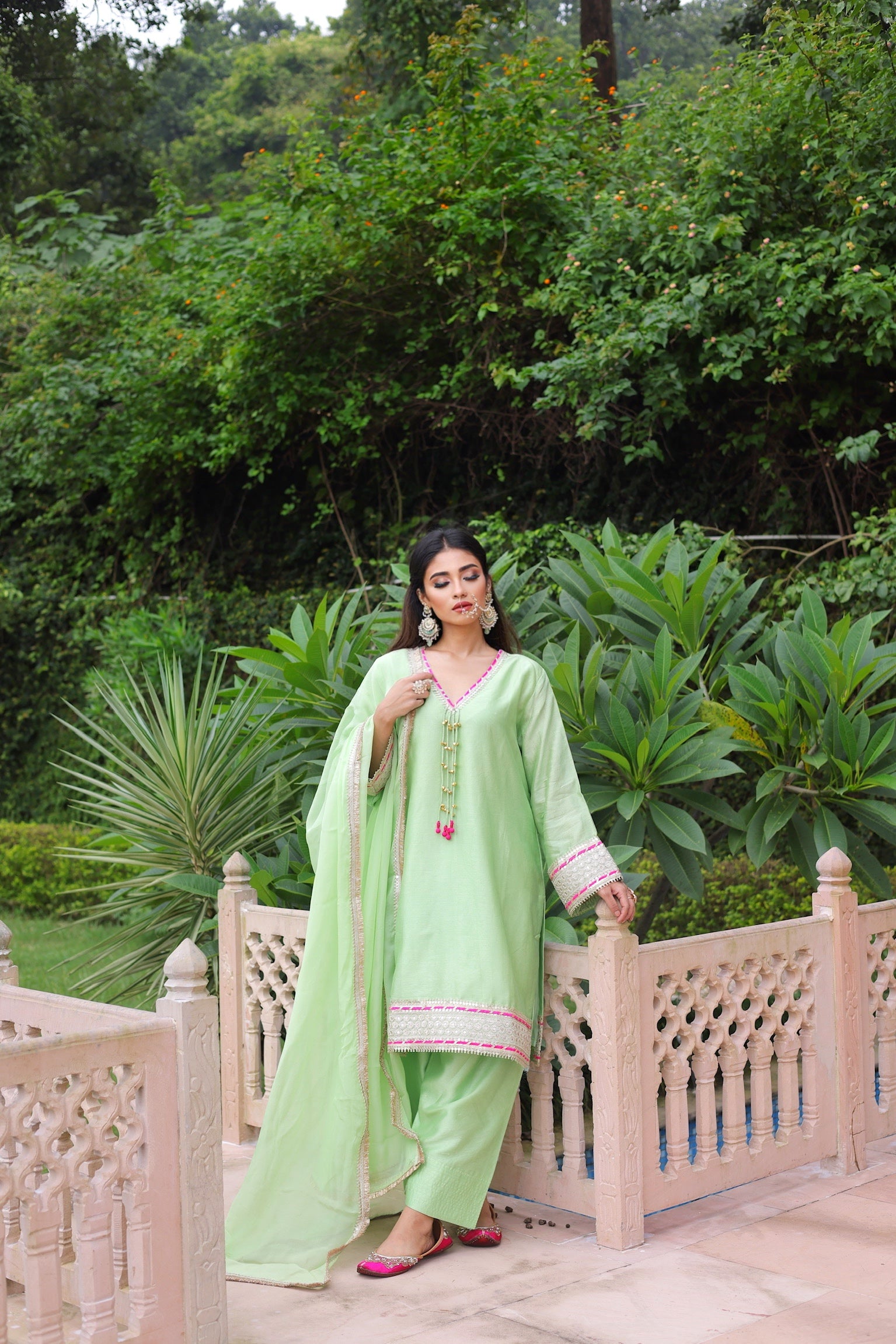 This set is quite a celebration of elegance and ease. Captures the calm charm of pastel green in a soft chanderi silhouette.