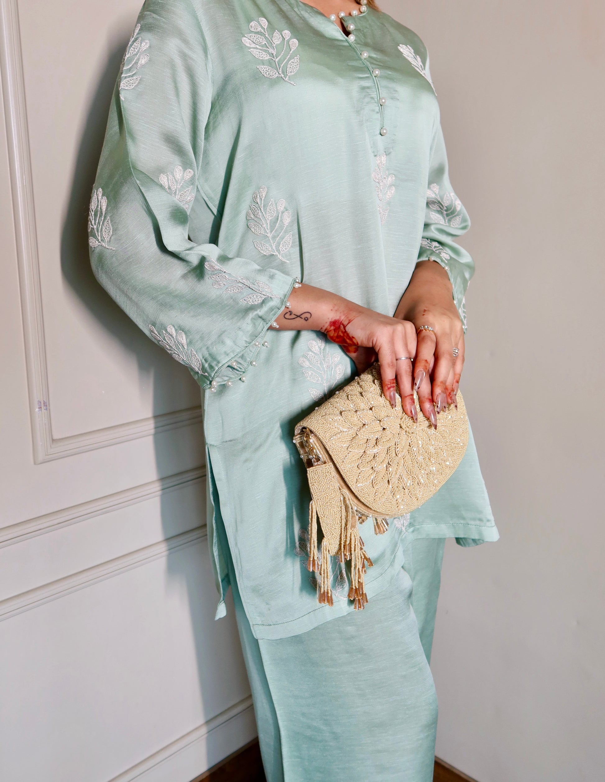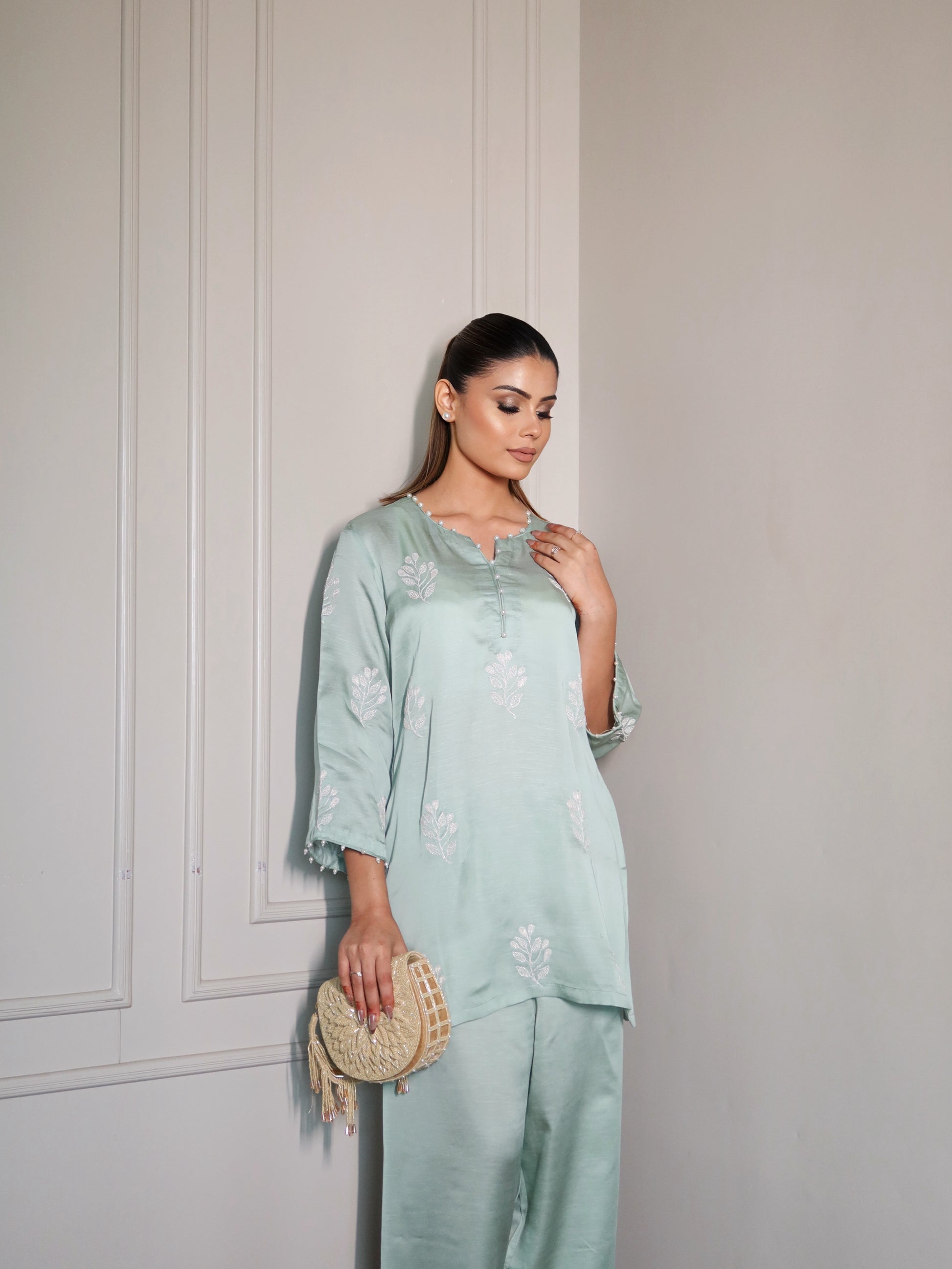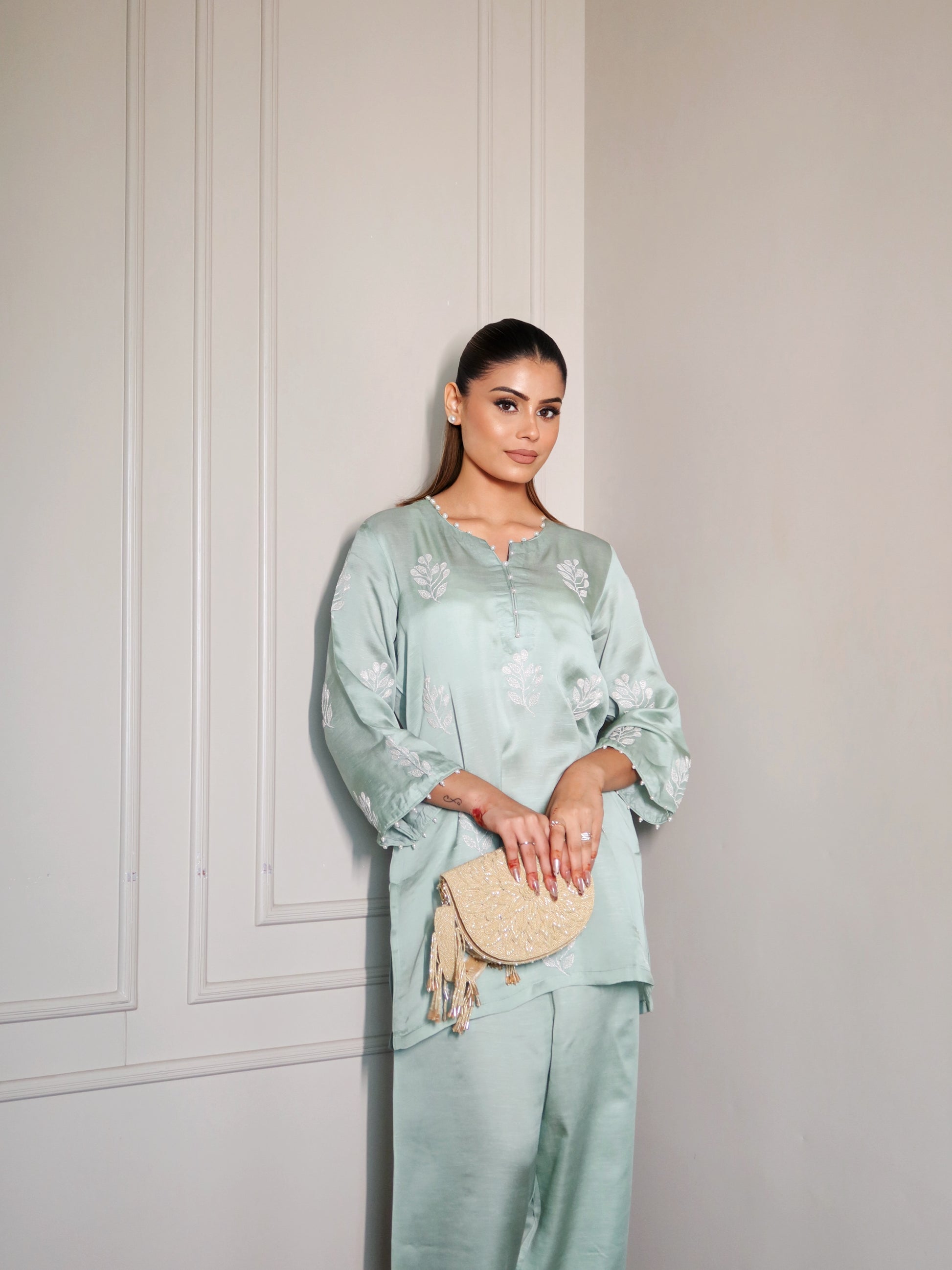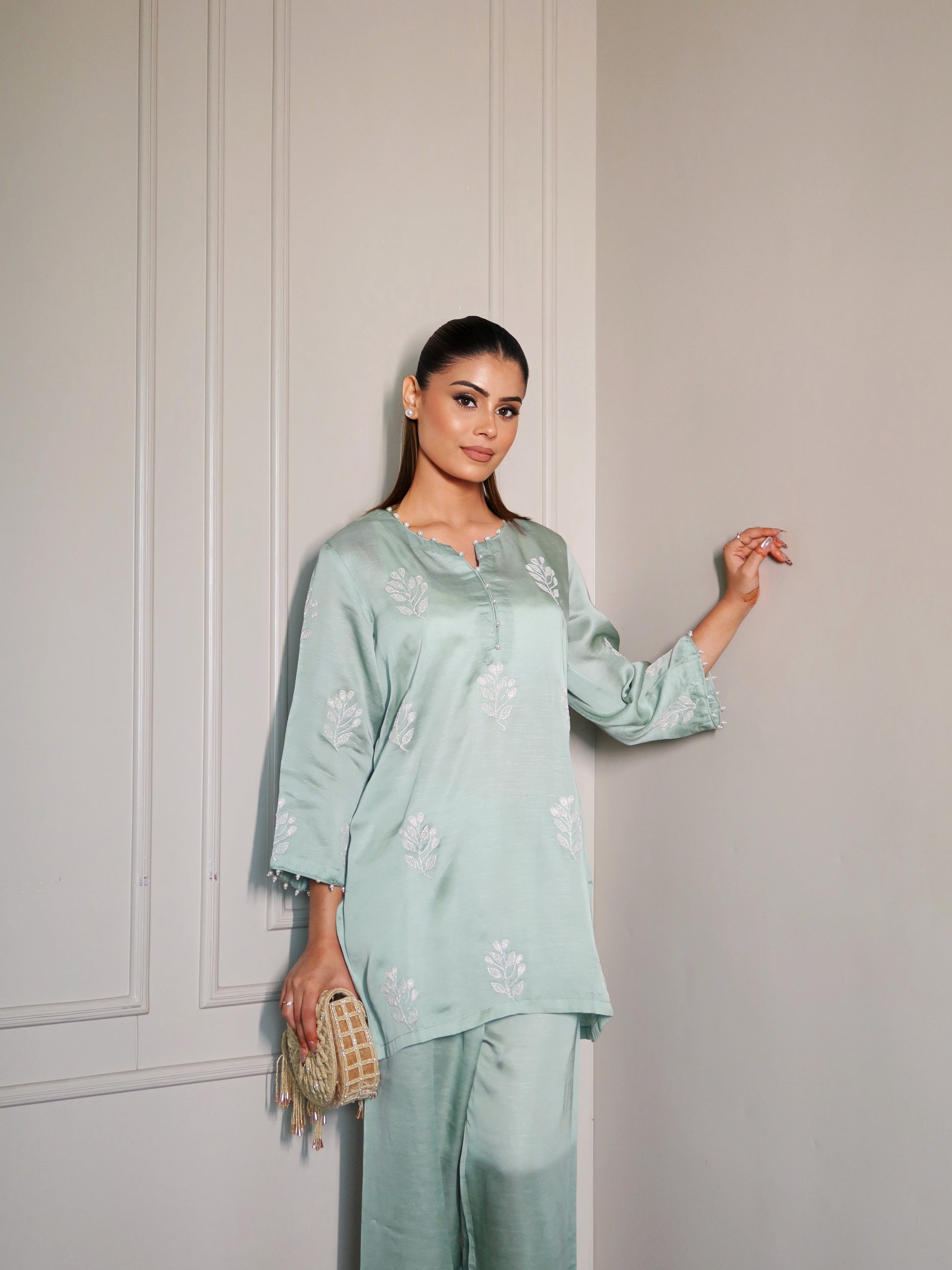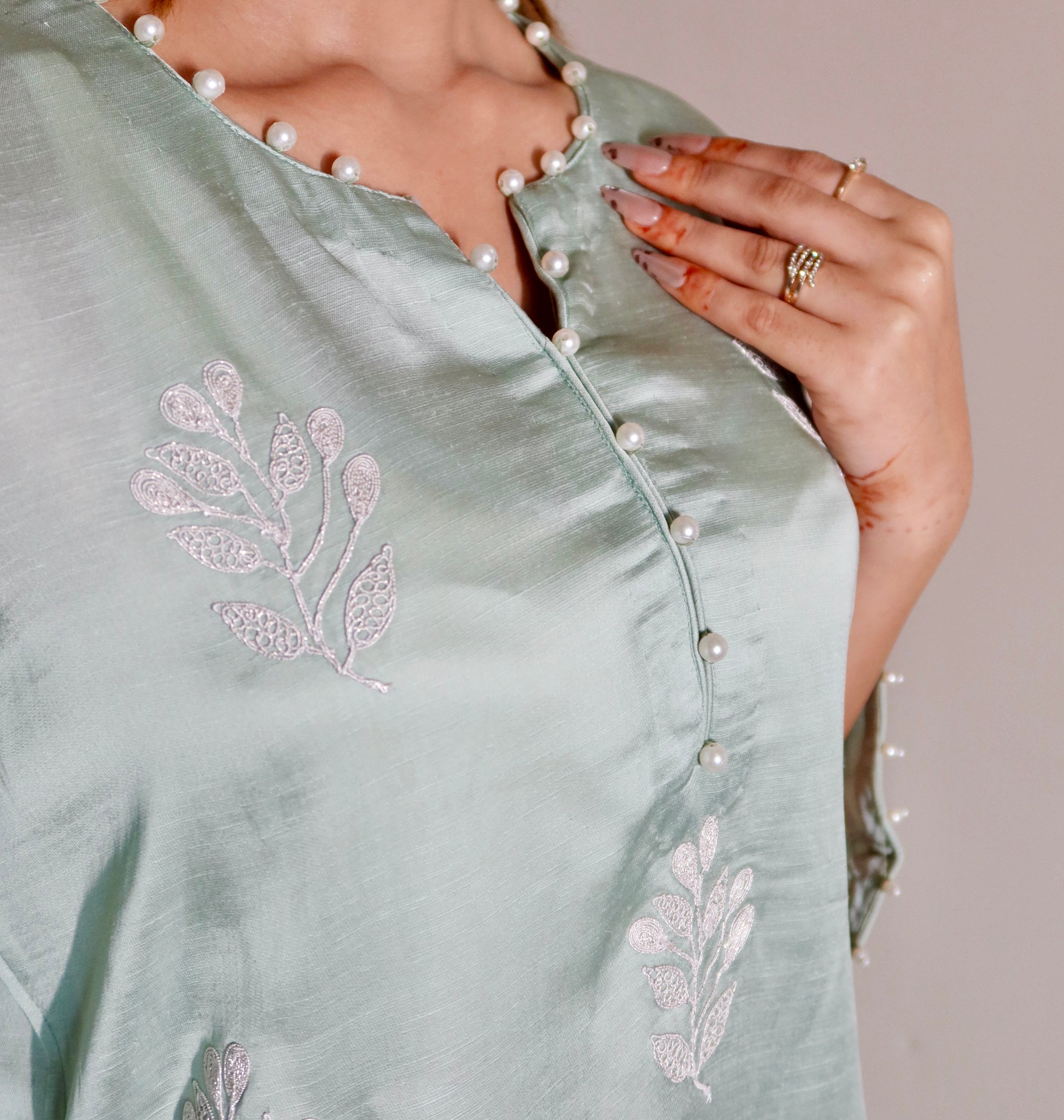 Sage green co-ord set detailed with subtle tonal whitish silver embroidery. Crafted in a lightweight fabric for a relaxed, polished look - perfect for breezy summer days.